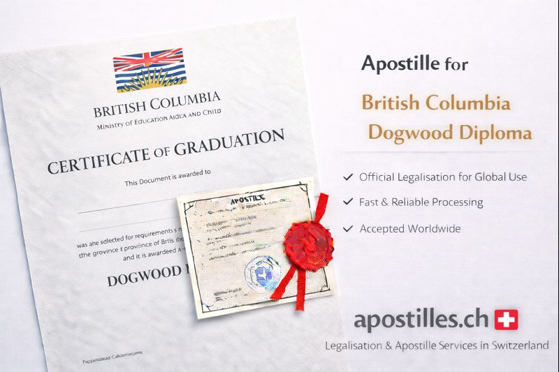 The British Columbia Dogwood Diploma — awarded through BC-accredited international schools — is recognised globally, but many universities and official bodies require apostille legalisation before accepting it. Apostilles.ch provides fast, secure apostille processing for Dogwood Diplomas issued or certified in Switzerland. Ideal for university admission, relocation, school transfer, or visa applications. We handle verification, submission, and apostille authentication end-to-end, ensuring your credential is accepted worldwide — without delays or paperwork challenges.