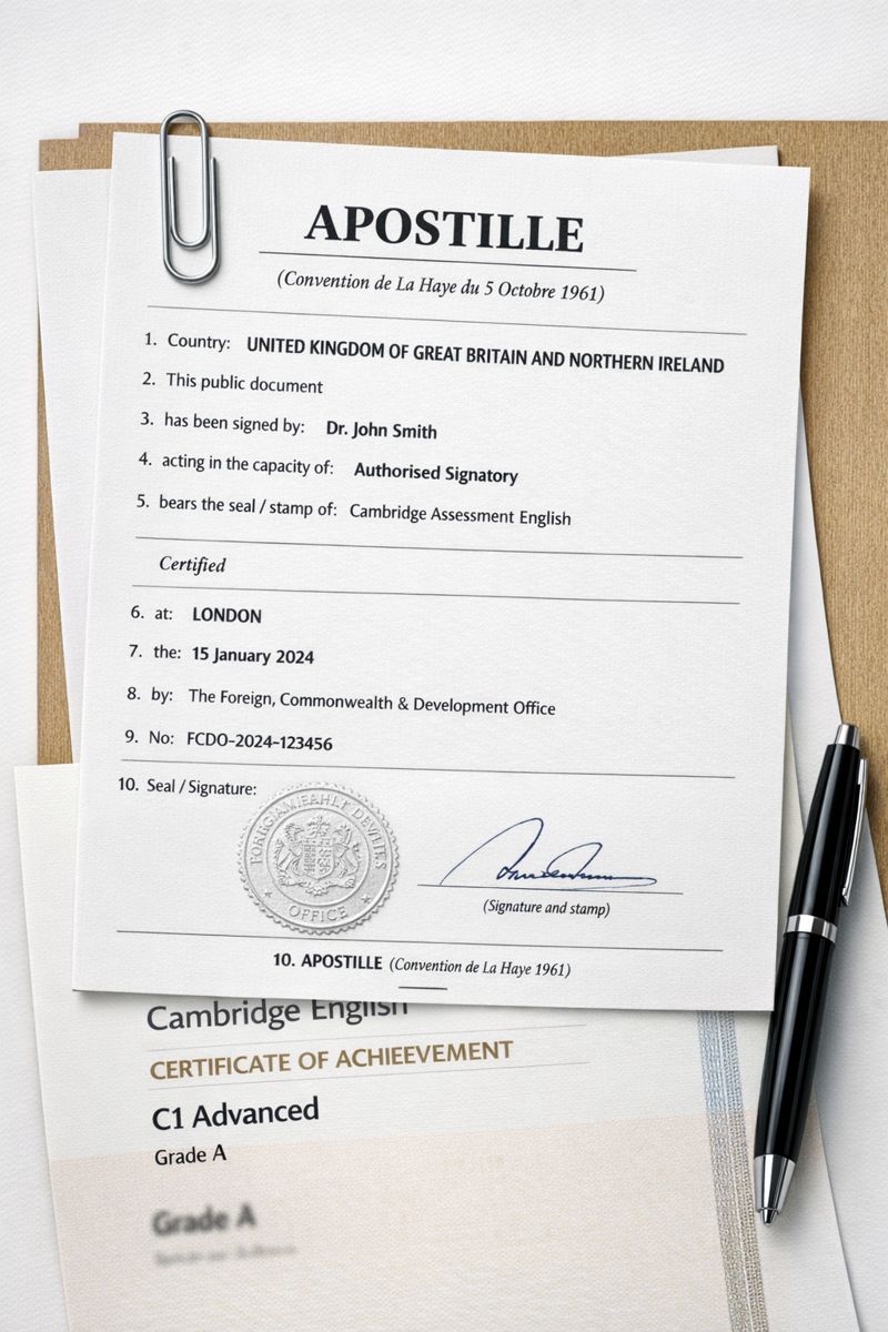 Without an apostille, applications may be delayed, returned, or rejected — even if the institution accepts Cambridge English qualifications academically.