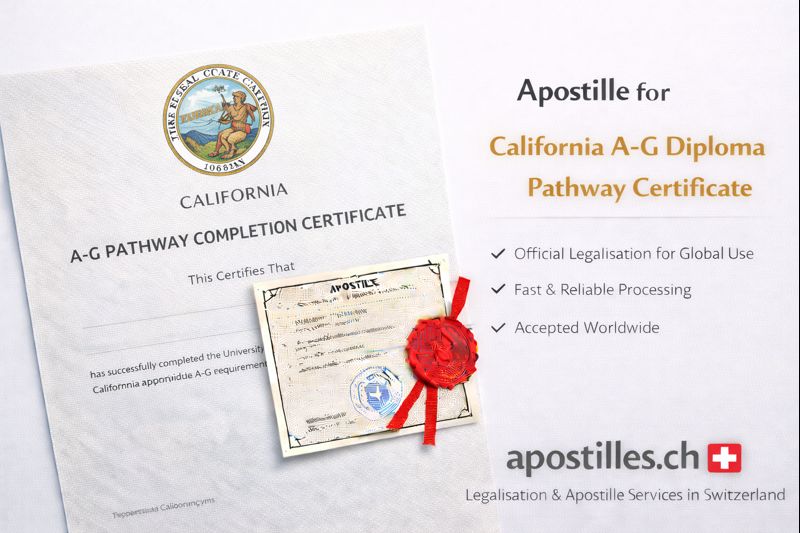 The California A–G pathway completion certificate confirms that students have fulfilled the subject requirements for university eligibility — even if issued by U.S.–curriculum schools outside California. But colleges, education authorities, and consulates often require apostille legalisation before accepting it. Apostilles.ch provides fast, secure apostille processing for A–G certificates issued or certified in Switzerland. Ideal for university admissions, relocations, school transfers, and visa documentation. We manage verification, submission, and apostille authentication — ensuring worldwide recognition with no hassle.