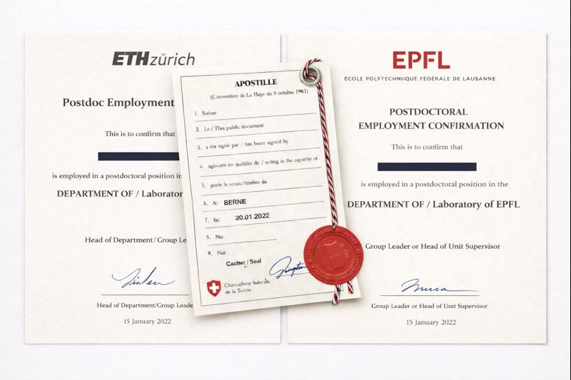 Obtaining an apostille for ETH Zurich and EPFL postdoctoral employment confirmation documents is essential if you plan to use your Swiss academic employment records abroad. An apostille certifies the authenticity of official employment documents and ensures their legal recognition in countries that are members of the Hague Apostille Convention of 1961. Without an apostille, postdoc employment confirmations issued by ETH Zurich or EPFL may not be accepted by foreign universities, research institutions, immigration authorities, funding bodies, or government agencies.