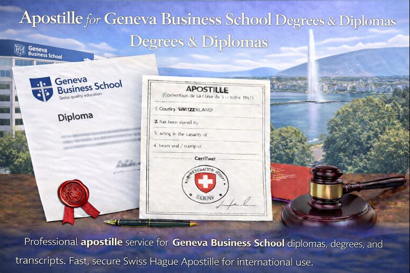 Professional apostille service for Geneva Business School diplomas, degrees, and transcripts. Fast, secure Swiss Hague Apostille for international recognition.