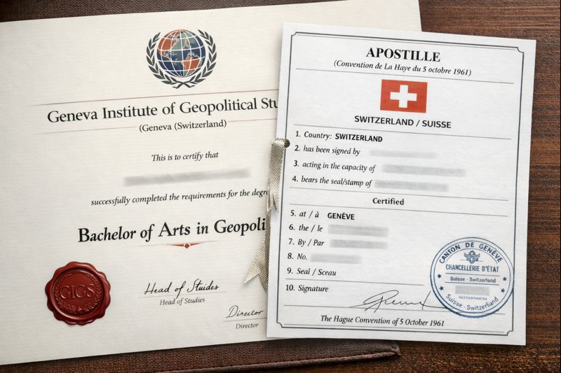The Geneva Institute of Geopolitical Studies issues academic credentials such as diplomas, degree certificates, transcripts, certificates of enrollment, and academic attestations. When these documents are intended for use in another country that is a member of the Hague Apostille Convention, they must be apostilled in Switzerland by the competent authority. Without an apostille, foreign institutions may refuse to accept them.