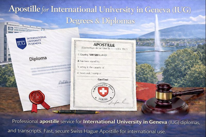The International University in Geneva (IUG) is a private, internationally oriented university offering undergraduate and graduate programs in international relations, business administration, international management, digital media, and global studies. Located in Geneva—one of the world’s major diplomatic and financial hubs—IUG attracts students who frequently require their qualifications for international careers, further studies, and professional recognition abroad. For these purposes, a Swiss apostille is often required.