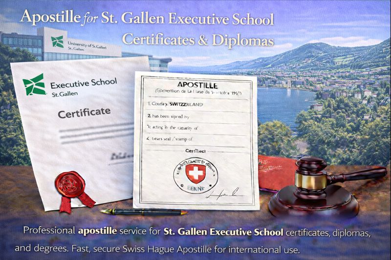 Professional apostille service for St. Gallen Executive School diplomas, degrees, and executive certificates. Fast, secure Swiss Hague Apostille for international recognition.