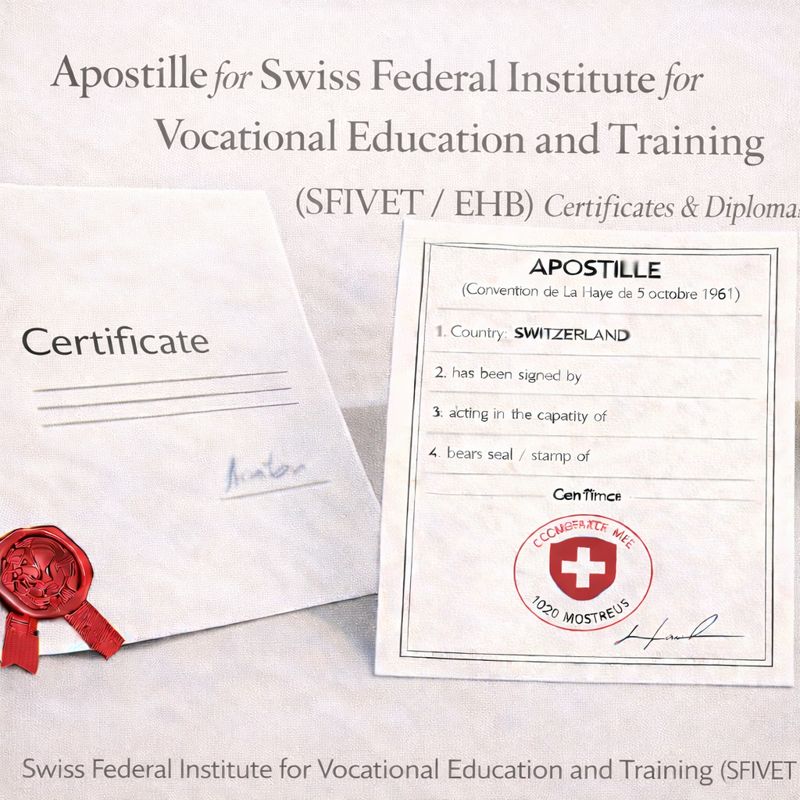 Professional apostille service for Swiss Federal Institute for Vocational Education and Training (SFIVET / EHB) diplomas, certificates, and transcripts. Fast, secure Swiss Hague Apostille for international recognition.