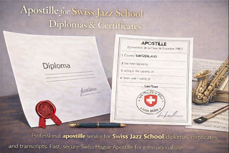 Professional apostille service for Swiss Jazz School diplomas, certificates, and transcripts. Fast, secure Swiss Hague Apostille for international use.