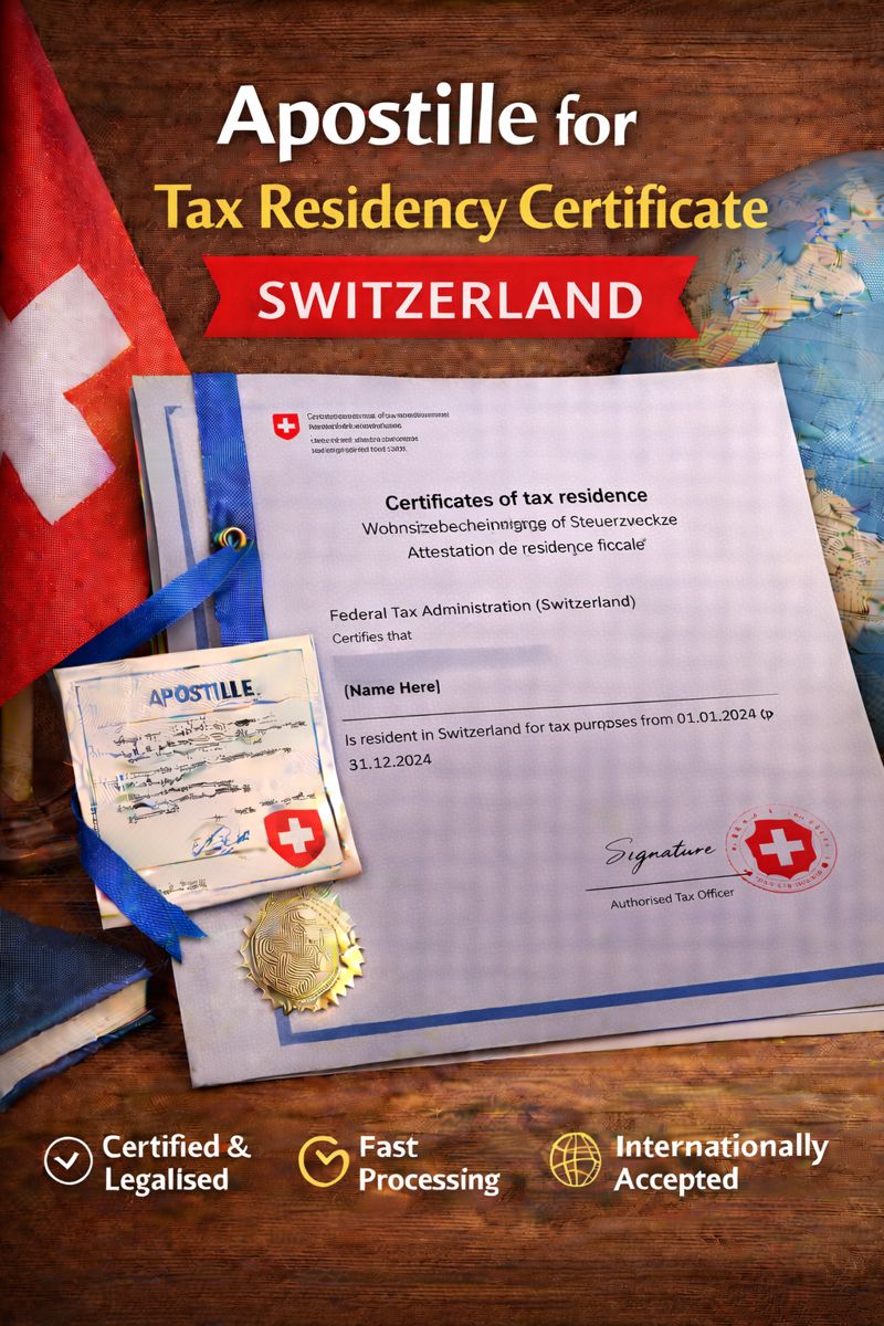 We provide professional apostille services for Tax Residency Certificates issued in Switzerland, ensuring your tax status is legally recognised abroad.