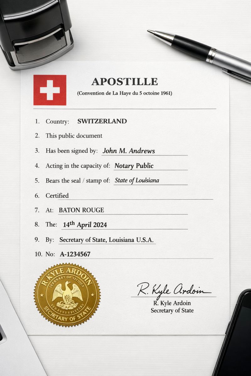 Swiss Apostille from Baton Rouge – 100% Remote Legalisation
