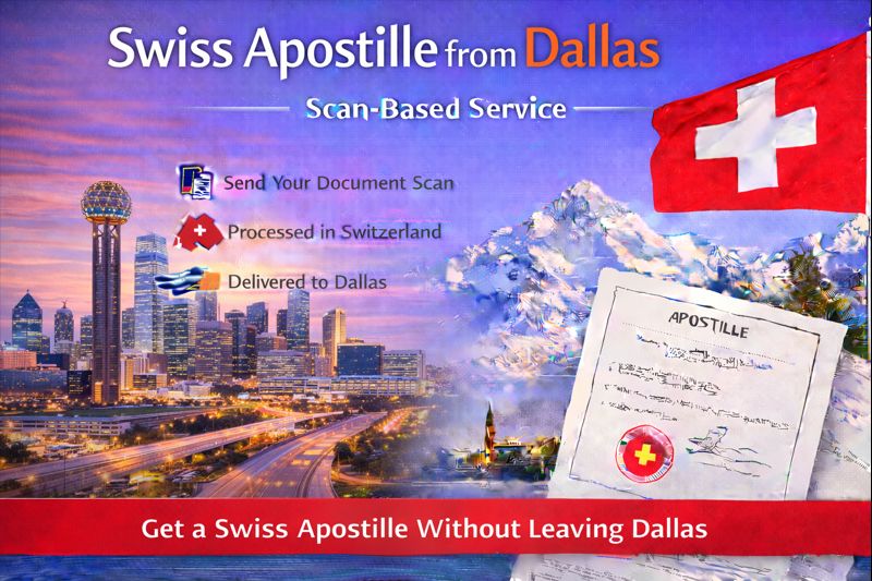 Get a Swiss apostille from Dallas without traveling to Switzerland. We handle the entire process remotely using a secure scan-based workflow.