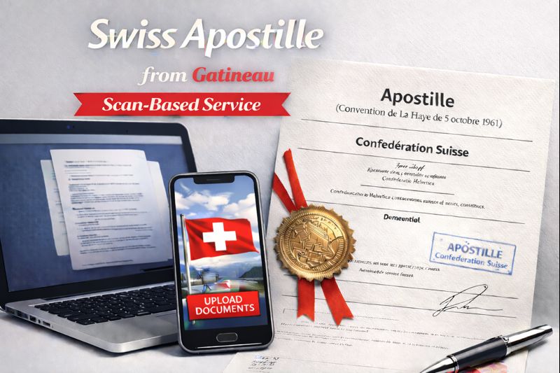 Based in Gatineau and need a Swiss apostille? Upload scanned documents — we authenticate and apostille them in Switzerland and return originals anywhere worldwide. Ideal for immigration, education, legal and business use.