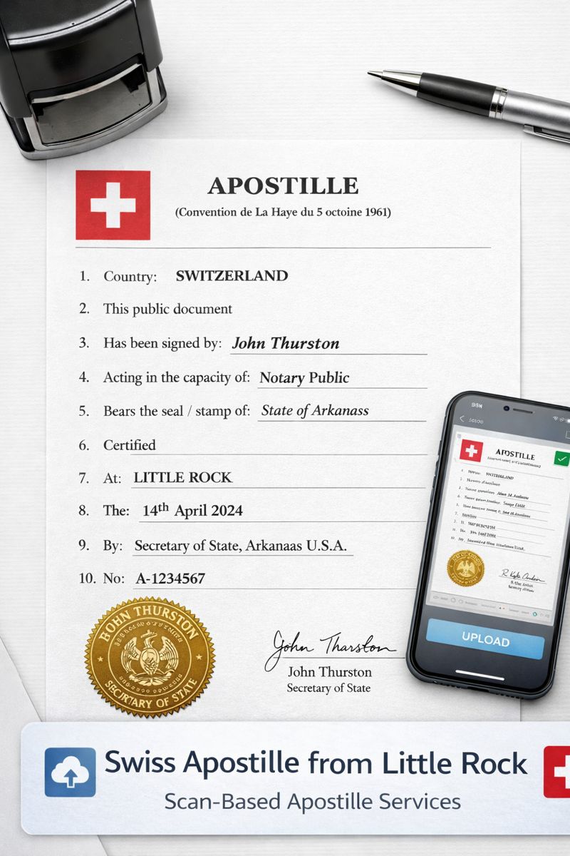 Swiss Apostille from Little Rock made simple with scan-based services. Upload your documents securely and let experts handle the full apostille process for Switzerland.