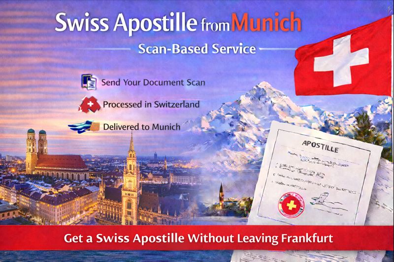 Get a Swiss apostille from Munich without traveling to Switzerland. We handle the entire process remotely using a secure scan-based workflow.