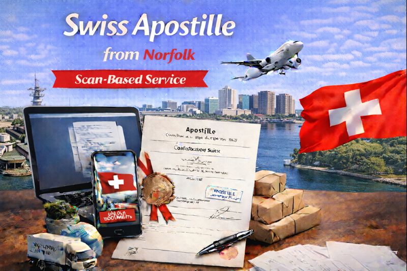 If you live in Norfolk and require a Swiss apostille, the process can feel complicated — especially because Swiss documents must be authenticated in Switzerland to be legally recognized overseas. Different authorities are involved depending on the type of document, and international mailing and compliance rules add layers of complexity. Our scan-based service makes the entire process fast, accurate, and stress-free for Norfolk residents.