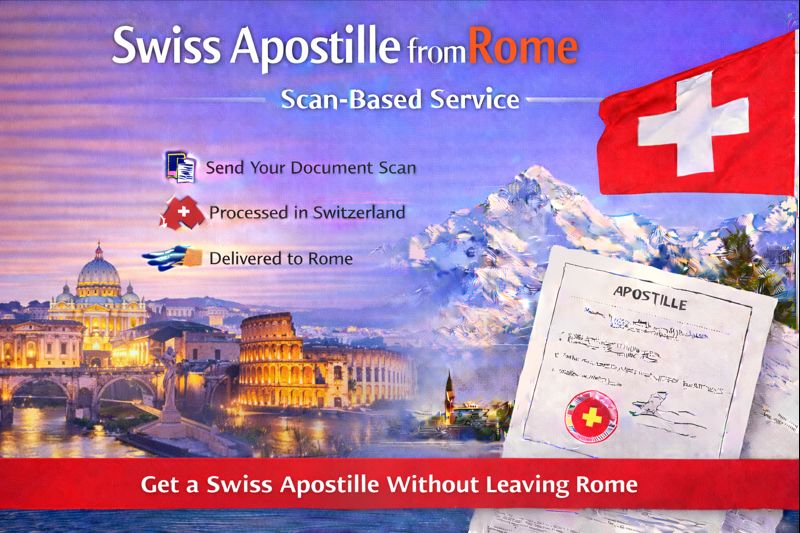 Get a Swiss apostille from Rome without traveling to Switzerland. We handle the entire process remotely using a secure scan-based workflow.