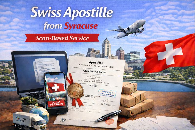 If you are based in Syracuse and need a Swiss apostille, you may quickly discover that the process is far from simple. Swiss documents must be authenticated inside Switzerland before they are accepted abroad, and navigating these requirements from the United States can be time-consuming and confusing. Our scan-based Swiss apostille service is designed to make the entire process effortless for Syracuse residents — no travel required.
