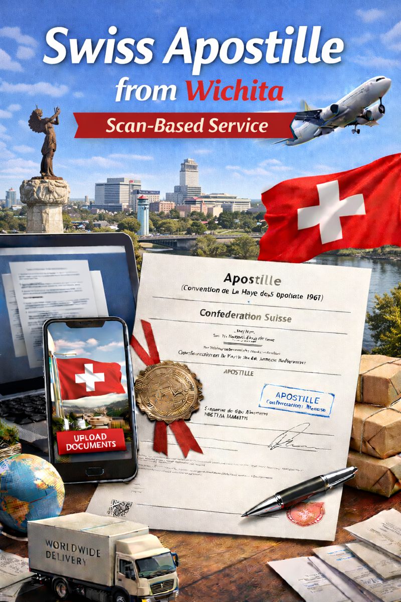 Based in Wichita and need a Swiss apostille? Upload scans of your documents and we’ll process legalization in Switzerland and return certified originals worldwide. Swift, fully remote, and ideal for legal, academic, business, and international use.