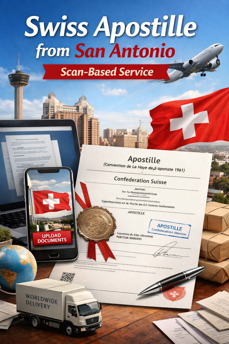 Need a Swiss apostille but based in San Antonio? Our scan-based service lets you submit documents digitally — no travel, no stress. We check, process, legalize, and return apostilled copies swiftly and securely worldwide. Ideal for personal, business, academic and immigration documents.